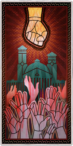 It was passing strange to barricade the very gates you sought to cross, but it all made sense when the fires began. The Scarlet Chorus sent a constant rain of flaming arrows over the walls of the Bastard City - a plague that lasted through long days and tireless nights. By the end, the blaze was too much for the city defenders to contain. Citizens crowded at the gates, pleading to be freed from their smoldering city. You and your army were happy to oblige them. When the gates opened, they opened from inside.